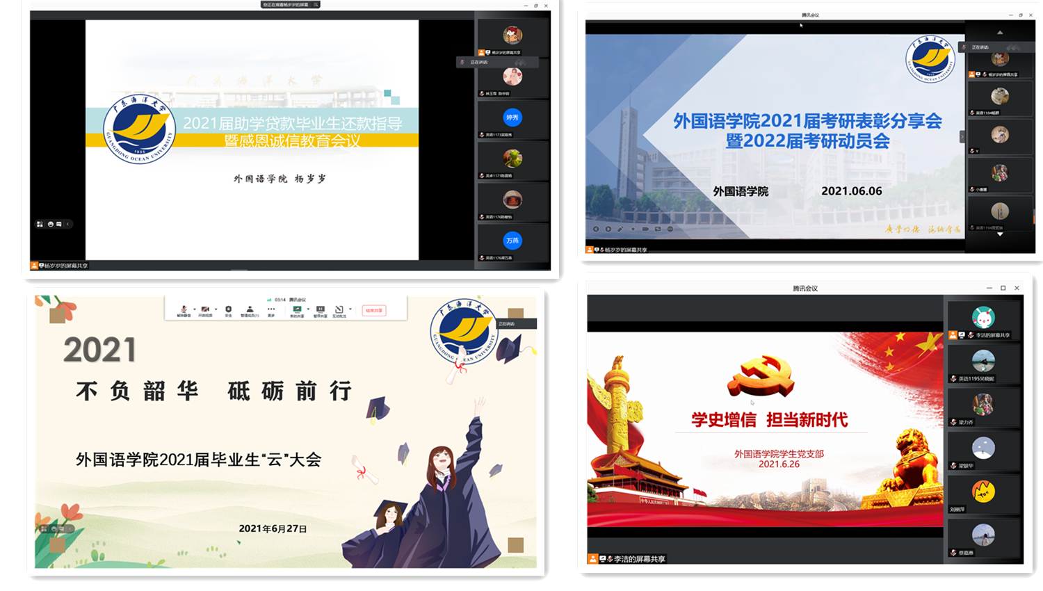 6月27日晚,太阳集团122cc召开“不负韶华 砥砺前行”欢送2021届毕业生“云”大会。太阳集团122cc全体领导、毕业生班主任、辅导员及2021届毕业生200多人参加了会议。与会领导和老师们历数本届毕业生取得的各项优秀成绩,肯定了同学们的努力与付出,表达了对同学们的不舍和祝福,嘱咐同学们要坚定理想信念,懂得感恩,砥砺奋斗。外院优秀毕业生代表韦杨辉回顾了大学四年的美好时光,感恩母校的教育和培养,表达了对海大的依依不舍之情,2018级员工代表魏俊杰感谢即将毕业的师兄师姐们对后辈的帮助和指导,祝福他们乘风破浪、披荆斩棘、前程似锦。会议进行中,同学们纷纷在留言框写下了自己的不舍、对老师的感激以及对母校的祝福。