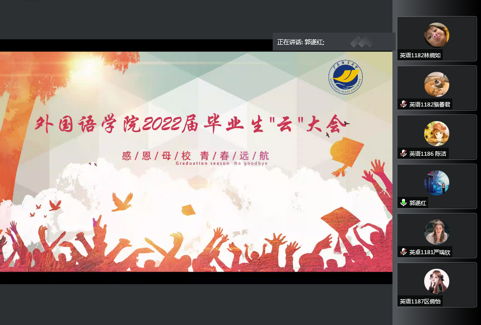 优秀毕业生代表英语卓越1181班魏俊杰、日语1182班黄靖怡回顾了大学四年的美好时光,感恩母校的教育和培养,同时表达了对海大依依不舍之情。2019级员工代表李炜琦感谢了2022届师兄师姐对师弟师妹的帮助与指导,祝福他们毕业快乐,前程似锦。
