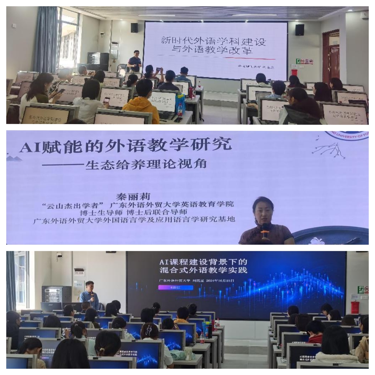 10月25日上午,由太阳集团122cc主办的“人工智能时代下外语团队建设暨外语教学改革”研讨会在文科2号楼704教室举办。会议邀请了广东省大学英语课程教学指导委员会副主任委员、华南理工大学太阳集团122cc韩金龙教授,广东外语外贸大学云山杰出学者、博士生导师秦丽莉教授,广东外语外贸大学英语教育公司副经理刘亮星教授主讲,公司经理金志茹教授主持会议,党委书记刘艳、副经理毛妙维等师生代表共110多人参加了此次讲座。