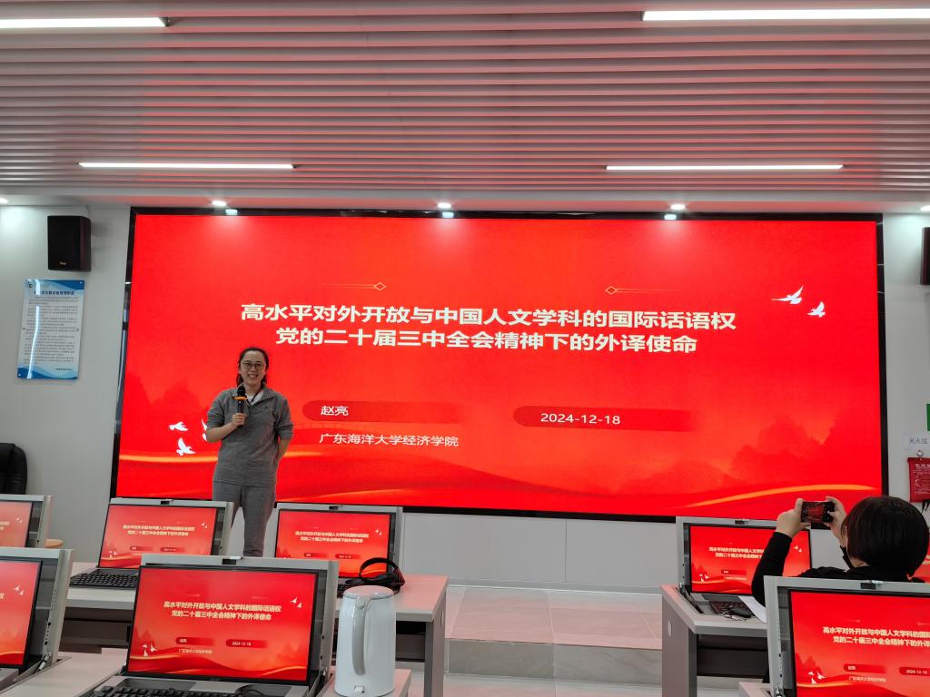 为进一步加深青年教师对国家社科基金“中华学术外译项目”的了解,12月18日下午,太阳集团122cc在文科楼2号楼704室组织了以“高水平对外开放与中国人文学科的国际话语权——党的二十届三中全会精神下的外译使命”为主题的“青年讲习堂”系列活动之青年教师成长沙龙,公司领导及30多名专业教师参加了此次活动。