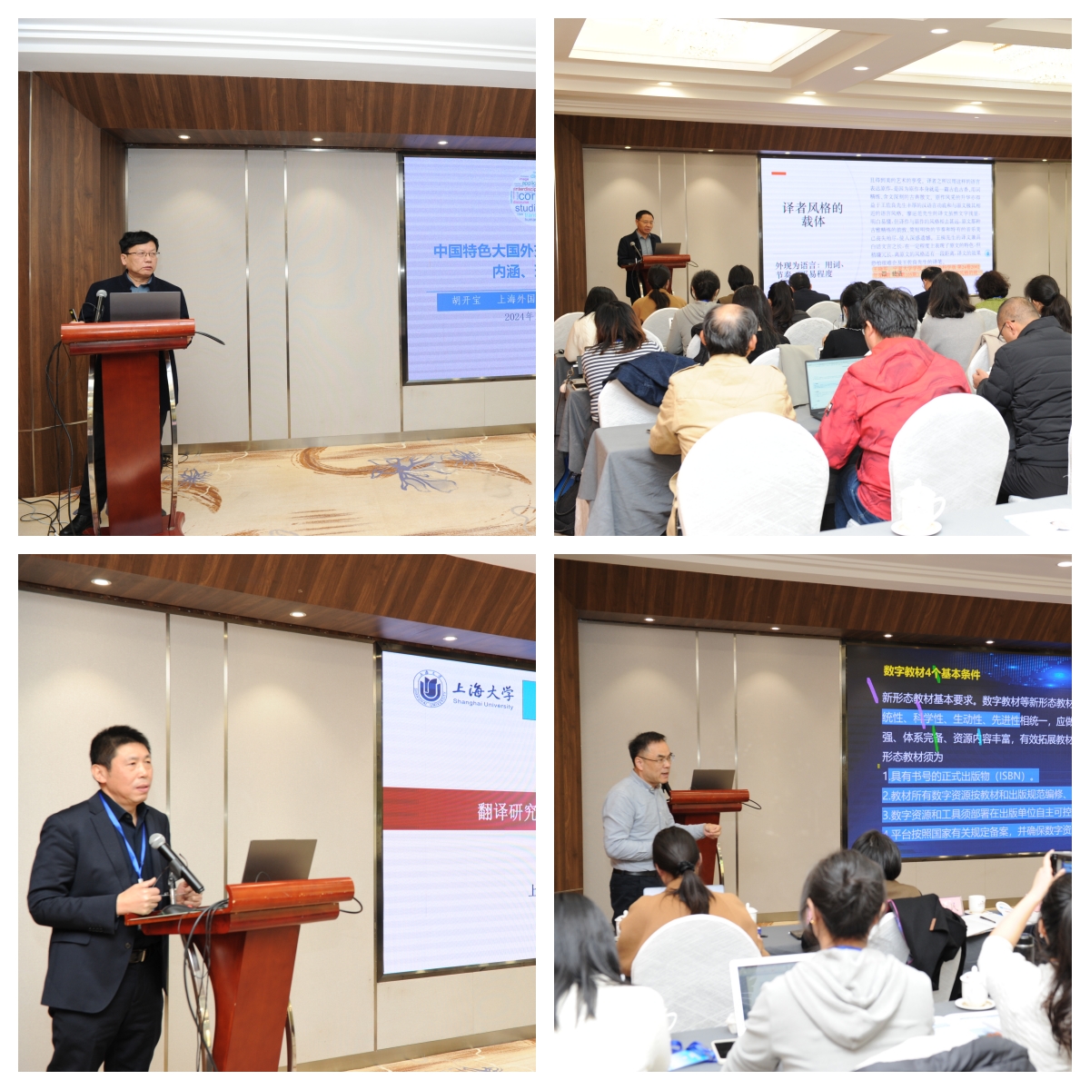 胡开宝教授以《中国特色大国外交话语传播:现状、问题与原则》为题,梳理了中国特色大国外交话语对外传播的内涵与现状,阐述了中国特色大国外交话语的对外传播应当遵循的原则。秦洪武教授以《译者风格的智能识别与分析》为题,以Sister Carrie的六个汉语译本为研究对象,对译者风格用语料库角度进行尝试性探索研究,为学者合理调用大语言模型和数据挖掘技术,更好地驾驭质性和量化分析,科学、可靠地进行混合型研究提供参考与借鉴。傅敬民教授以《翻译研究前沿选题、论文写作与发表》为题,结合《上海翻译》的办刊经验,围绕如何确定有效的前沿选题、如何撰写有效的翻译研究学术论文、如何促使研究成果得到广泛的关注提出了具体的建议和有效的指导。胡加圣教授以《大学外语数字教材建设与智慧教学模式构建的思考》为题,提出大语言模型的成熟,推动形成新的大学外语数字化教学范式,以数字化赋能智慧教学,结合大语言模型的应用,可以推动大学外语教学的全面改革和创新。