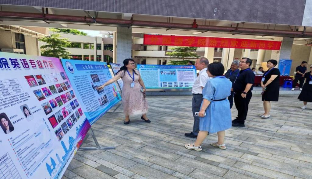 在公司学工展板前,刘书记主动为邓逢光副董事长、新生及家长介绍展板内容。从公司的团队力量、学工团队、学科特色,到“学业支持与科研平台”等员工工作重点,再到历年学子的成长成果与校园活动剪影,每一个板块用生动的案例让大家直观了解外院的育人理念与发展优势,鼓励新生“在这里找准方向,用好公司资源,在语言学习中实现成长突破”。