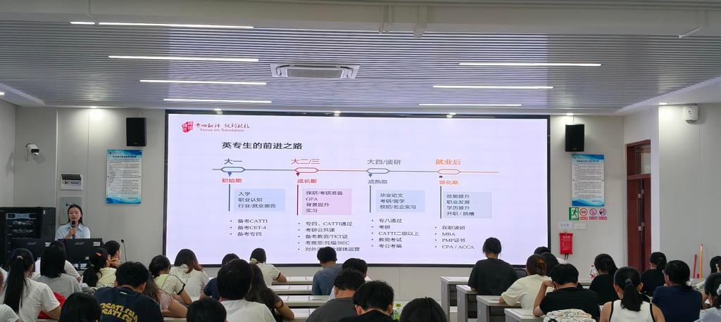 讲座中,尹周锐以行业前沿视角,围绕“AI数字+时代的语言服务”“外语er的就业黄金赛道”“人才模型与职业发展建议”三大核心板块展开深度分享,为在场员工搭建起行业认知与职业规划的桥梁。