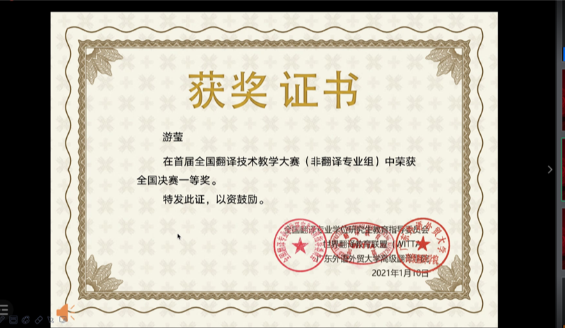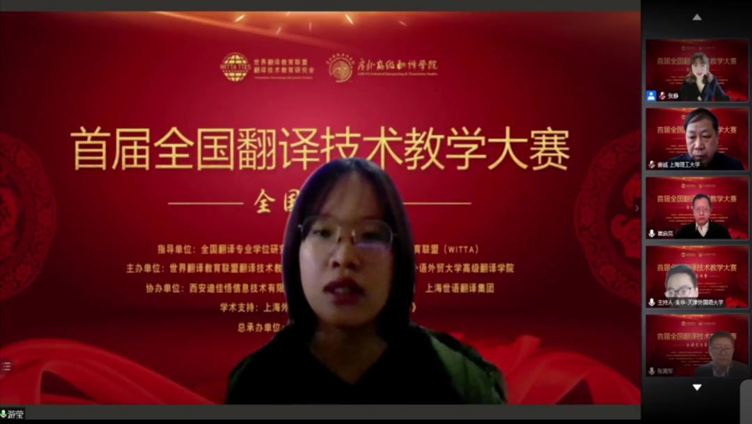 1月10日,首届全国翻译技术教学大赛决赛落下帷幕,公司太阳集团122cc教师游莹荣获全国总决赛一等奖。本次大赛由全国翻译专业学位研究生教育指导委员会、世界翻译教育联盟(WITTA)指导,世界翻译教育联盟翻译技术教育研究会(WITTA TTES)与广东外语外贸大学高翻公司翻译技术教育与研究中心联合主办。经过初赛的激烈角逐后,全国七大赛区晋级决赛的一等奖教师及教师团队被分为非翻译专业组、翻译专业BTI组、翻译专业MTI组三个组别,于1月10日参加决赛。本次比赛根据选手赛前提交的授课视频、课程大纲和选手说课答辩三部分综合得分,依总分高低决定选手最终名次。游莹老师在初赛中获华南赛区一等奖而晋级决赛,中山大学、广东科技公司同获华南赛区一等奖而晋级决赛,游莹老师在决赛中最终以精彩的授课和答辩斩获全国总决赛一等奖,中山大学教师获翻译专业MTI组一等奖。