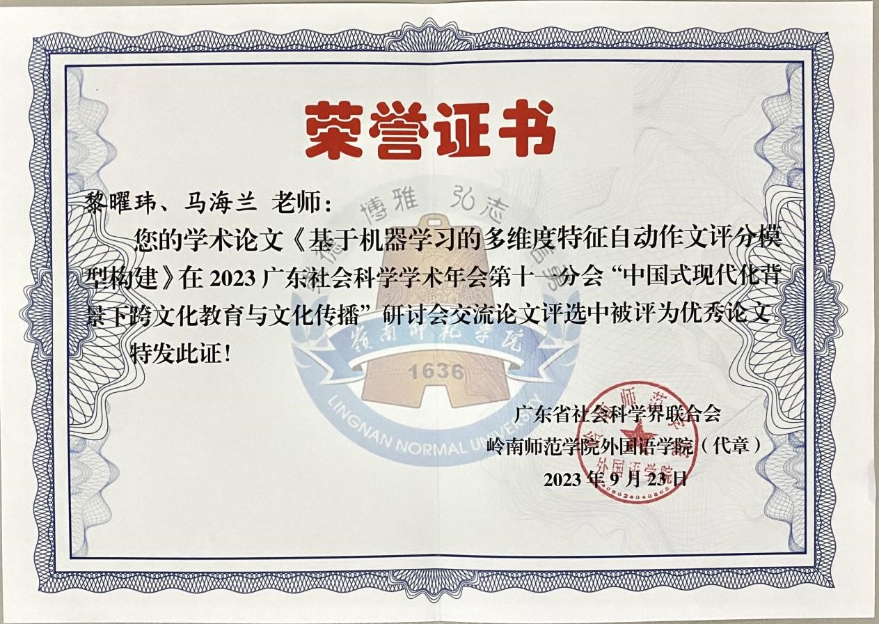公司教师蒋侠博士在会上展示了论文‘中国武术文化的多模态国际传播——基于《影》字幕翻译的多模态语用分析’;黎曜玮老师宣读了与马海兰老师合著的论文‘基于机器学习的多维度特征自动作文评分模型构建’。两位老师的论文展示得到了与会专家学者的一致好评。其中黎曜玮和马海兰合著的论文荣获2023年广东社会科学学术年会第十一分会优秀论文。