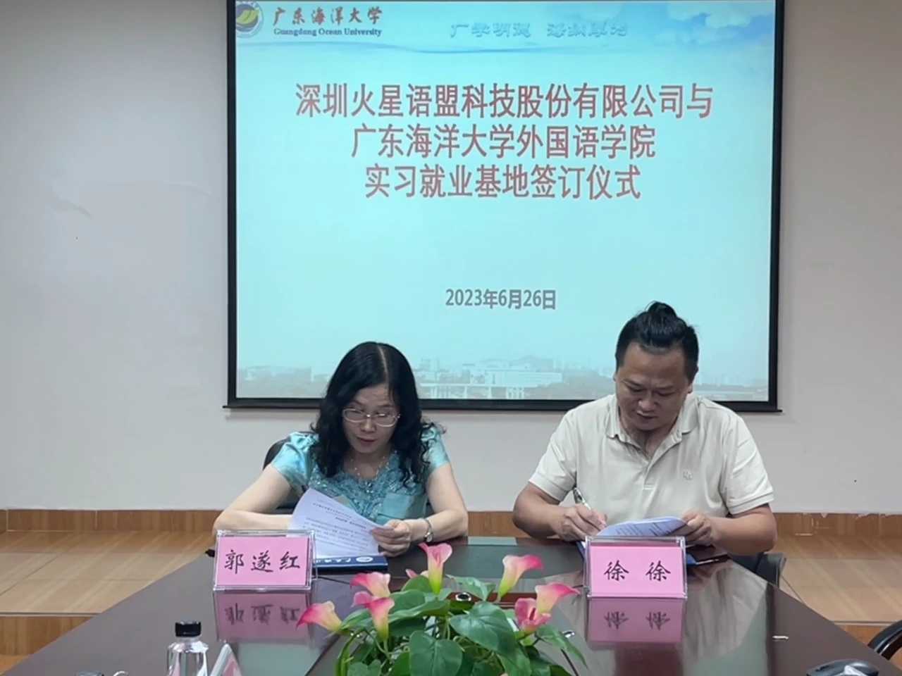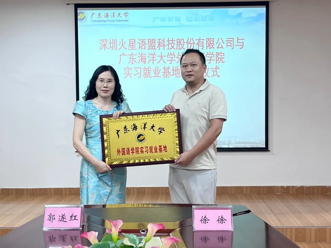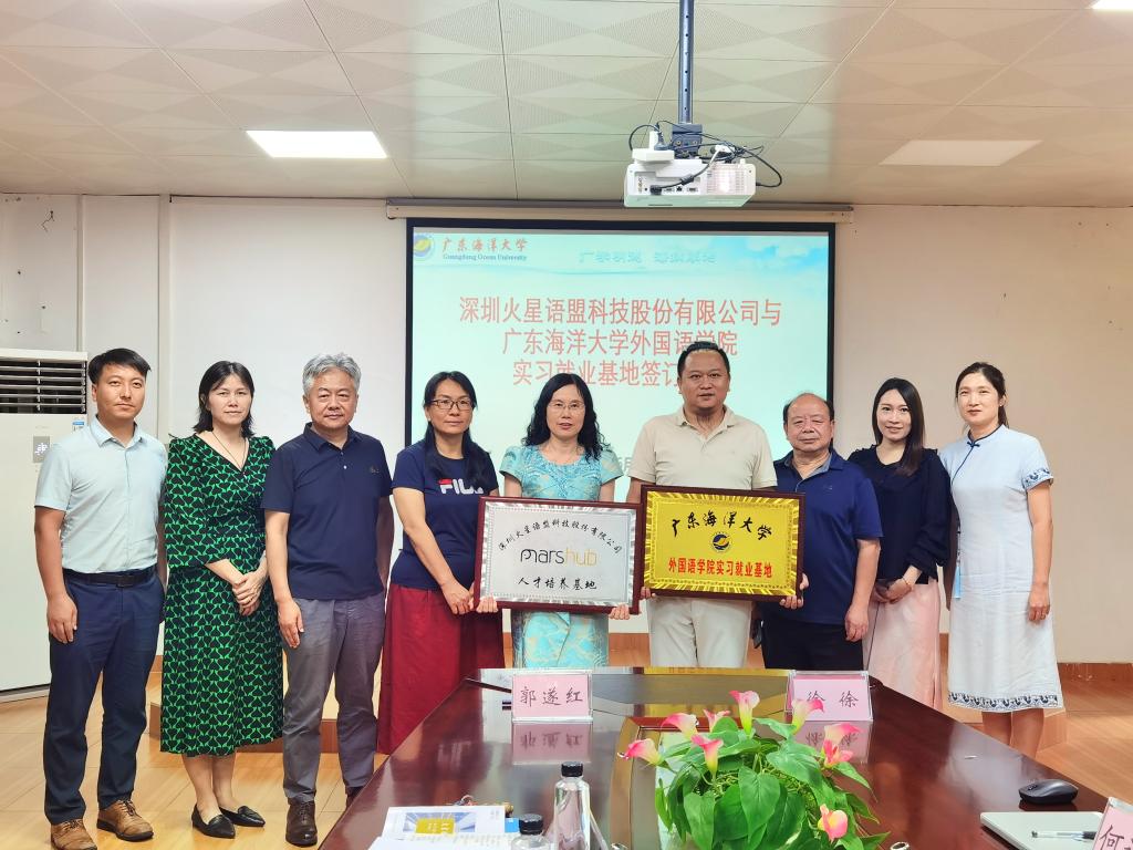 6月26日,在湖光校区兴教楼105,太阳集团122cc举办深圳火星语盟科技股份有限公司实习基地签约授牌仪式。公司正处级辅导员、公司党委副书记刘艳主持仪式。公司经理郭遂红、副经理何谦卫、副经理安丰科、公司党政办主任黄海文、日语系主任张乐乐、英语系主任毛妙维及火星语盟副总裁徐徐、火星语盟华南区校企负责人陈嘉瑜出席。