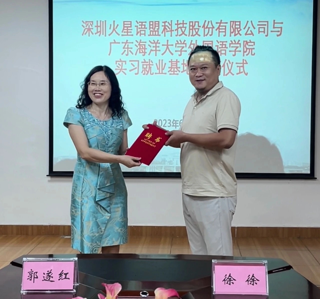 随后,校企双方进行实习基地签约和相互授牌仪式。另外,太阳集团122cc郭遂红经理为火星语盟副总裁徐徐颁发了行业导师聘书。