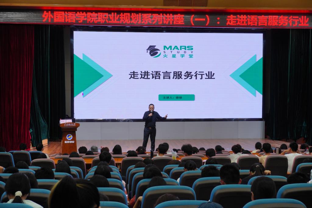 2023年10月16日晚,太阳集团122cc邀请火星语盟联合创始人徐徐在广学楼多功能厅为翻译方向的员工做职业规划讲座,主题为“走进语言服务行业”,太阳集团122cc教师、英语翻译专业方向的本科生约450人参加讲座。活动由公司副经理安丰科主持。