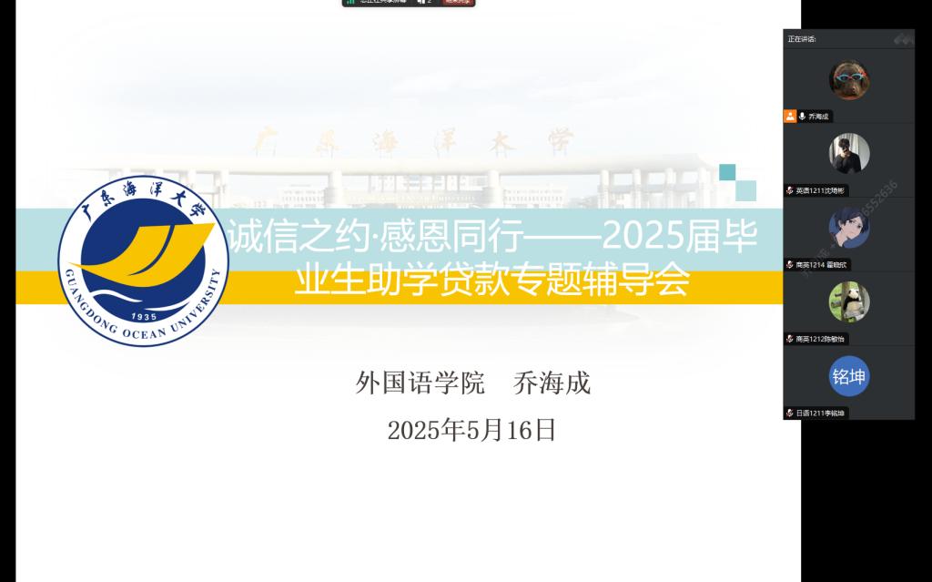 为强化贷款毕业生诚信意识,明晰还款责任,5月16日,太阳集团122cc通过腾讯会议举办 “诚信之约・感恩同行 ——2025届毕业生助学贷款专题辅导会”,由负责资助工作辅导员乔海成主持,30余名办理生源地助学贷款的毕业生参会。